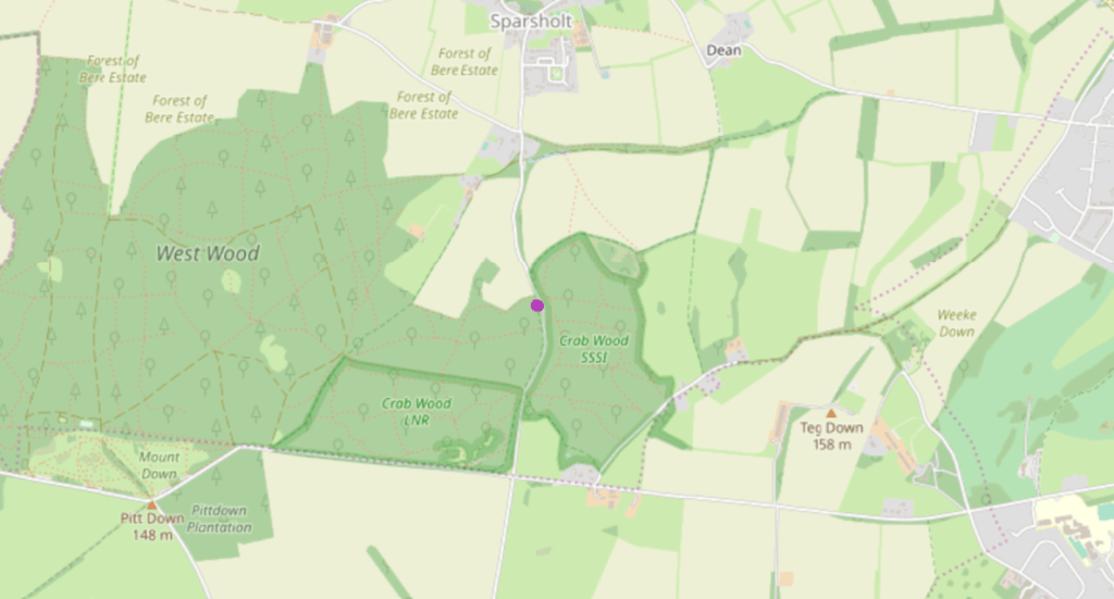If you want to visit, the tree is on the left side just before you leave the woods on the way to Sparsholt Village. It lies next to the path which leads up along the wood boundary.