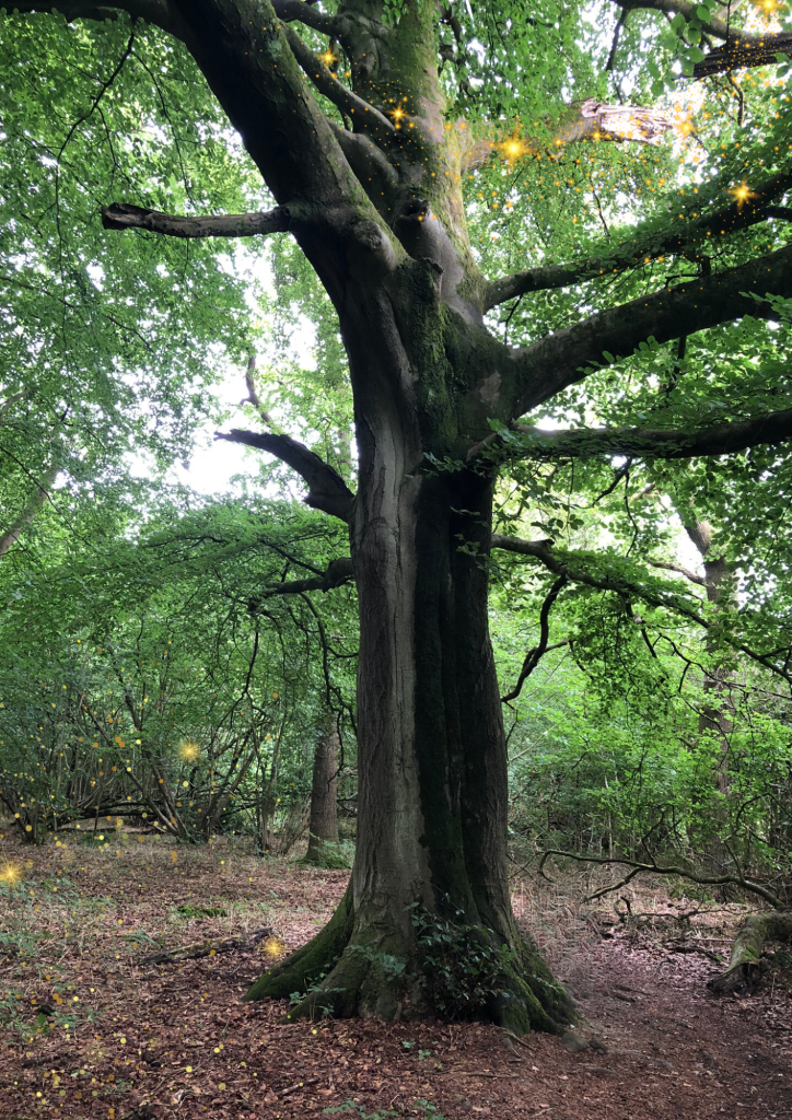 I walked towards her and her energy was strong. She invited me to connect with her, so I walked around her once, and then leaned my back against her wide trunk. Then I heard her say: I am an old woman, guardian of these woods for many years. I hold the elemental energies of this place, ensuring all is kept in balance. She felt so old, like a grandmother, and all the trees were her children. Much like the tree in the woods beside Lainston house on a previous visit.