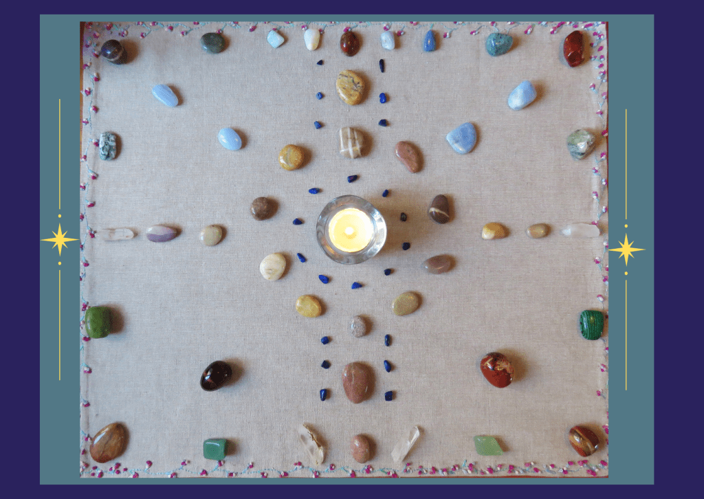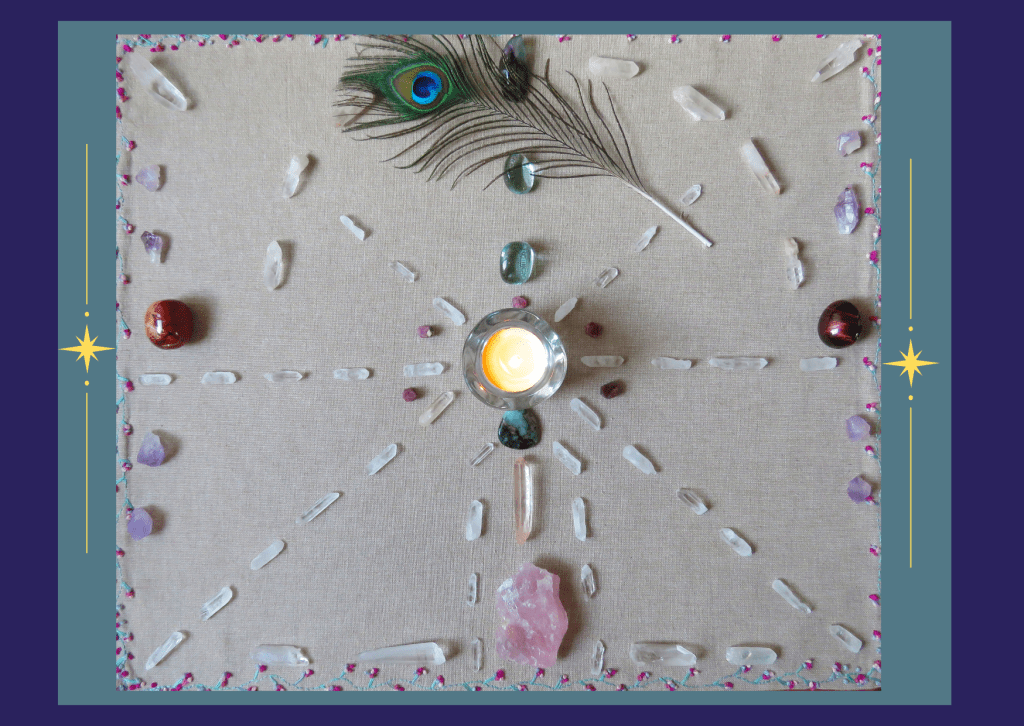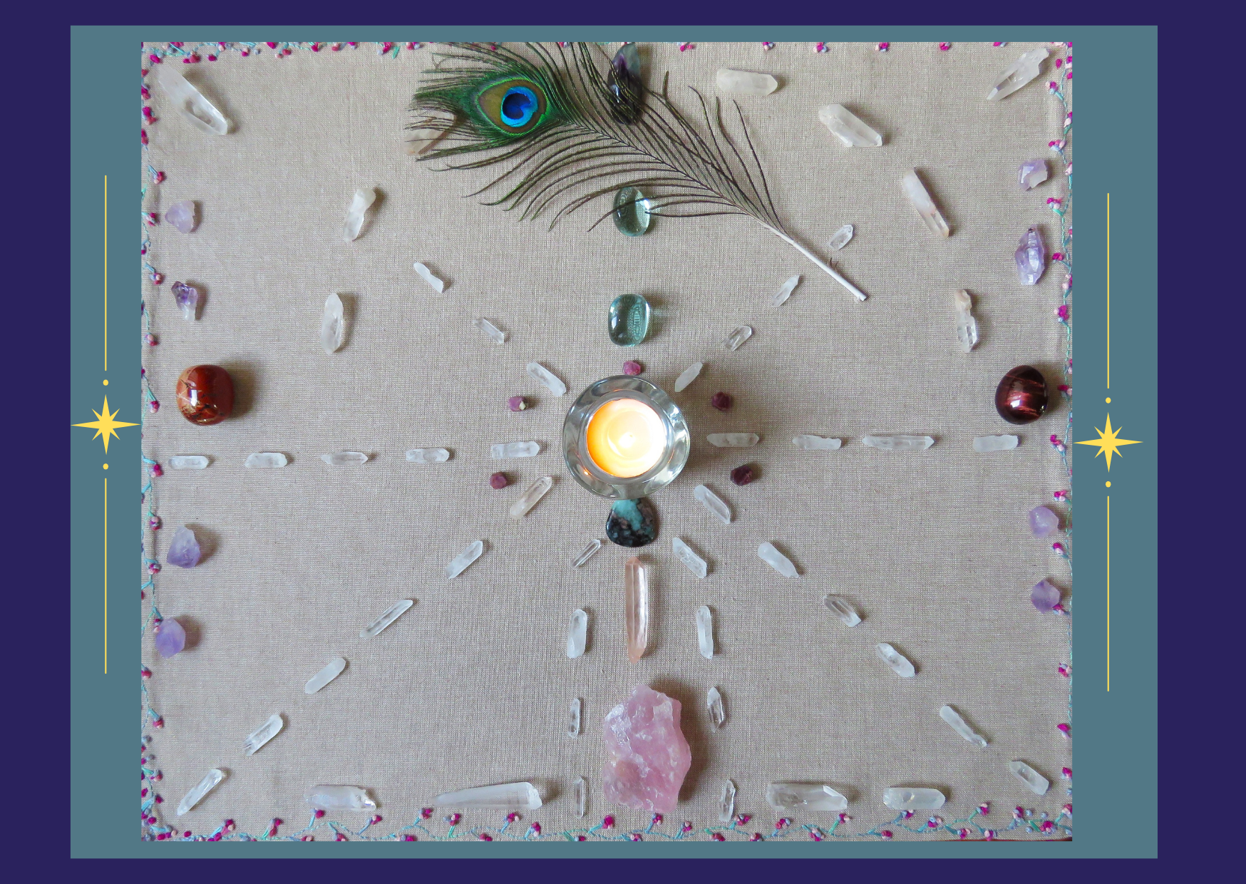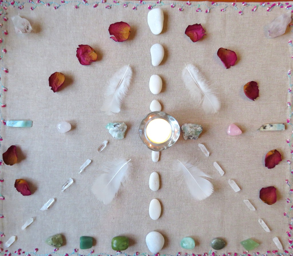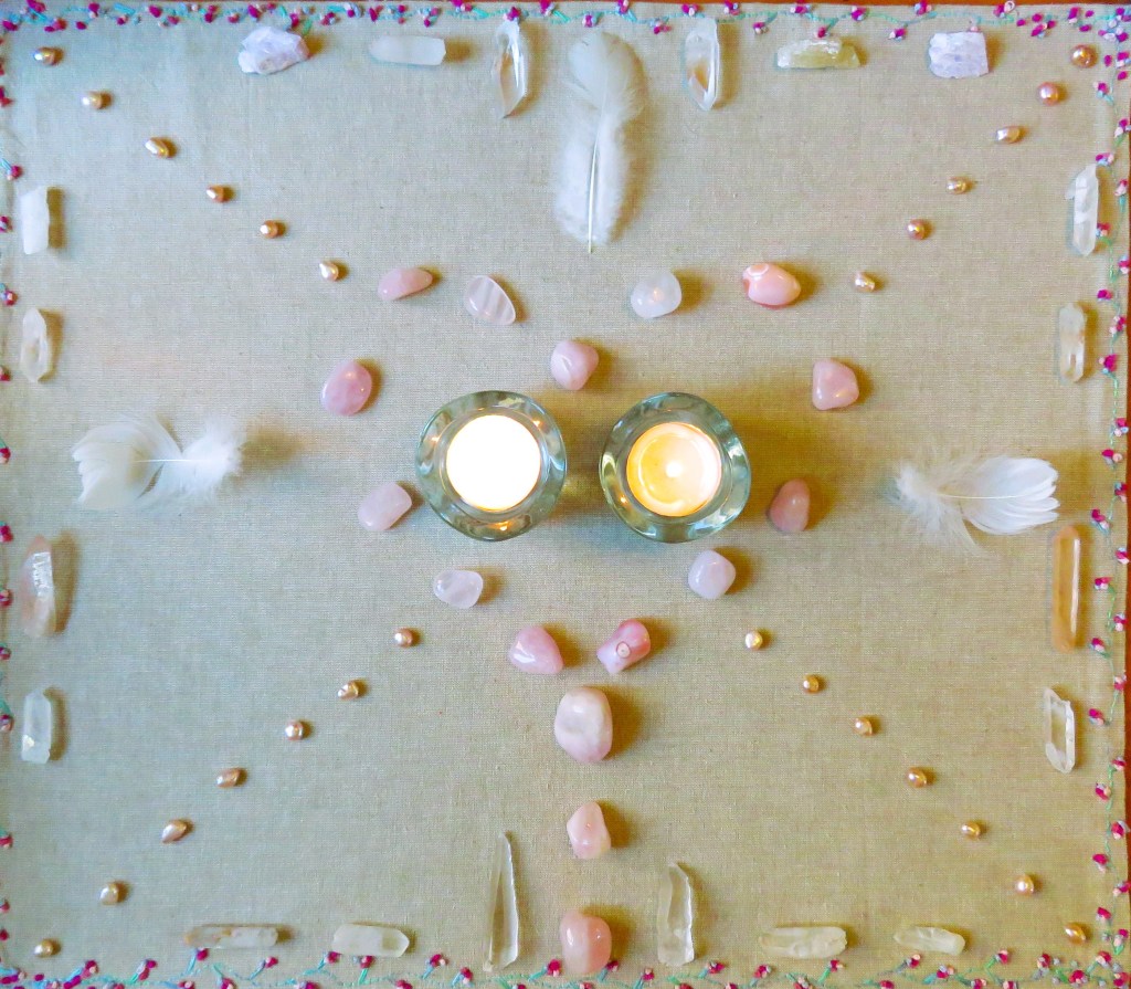 The grid needed to have more fire than usual, so four candles were placed, each one in its own corner. Once the flames were lit, I was instructed to place water in the center. Next, the quartz crystal circle was aranged around the water. This circle felt like a representation of the stone circles. Then an amethyst point was placed in North, South, East and West of the grid, connecting the circle to each of the four directions and holding all in balance.