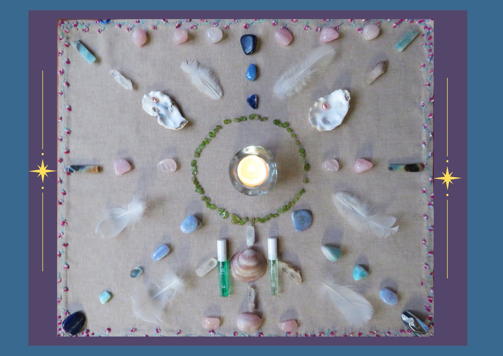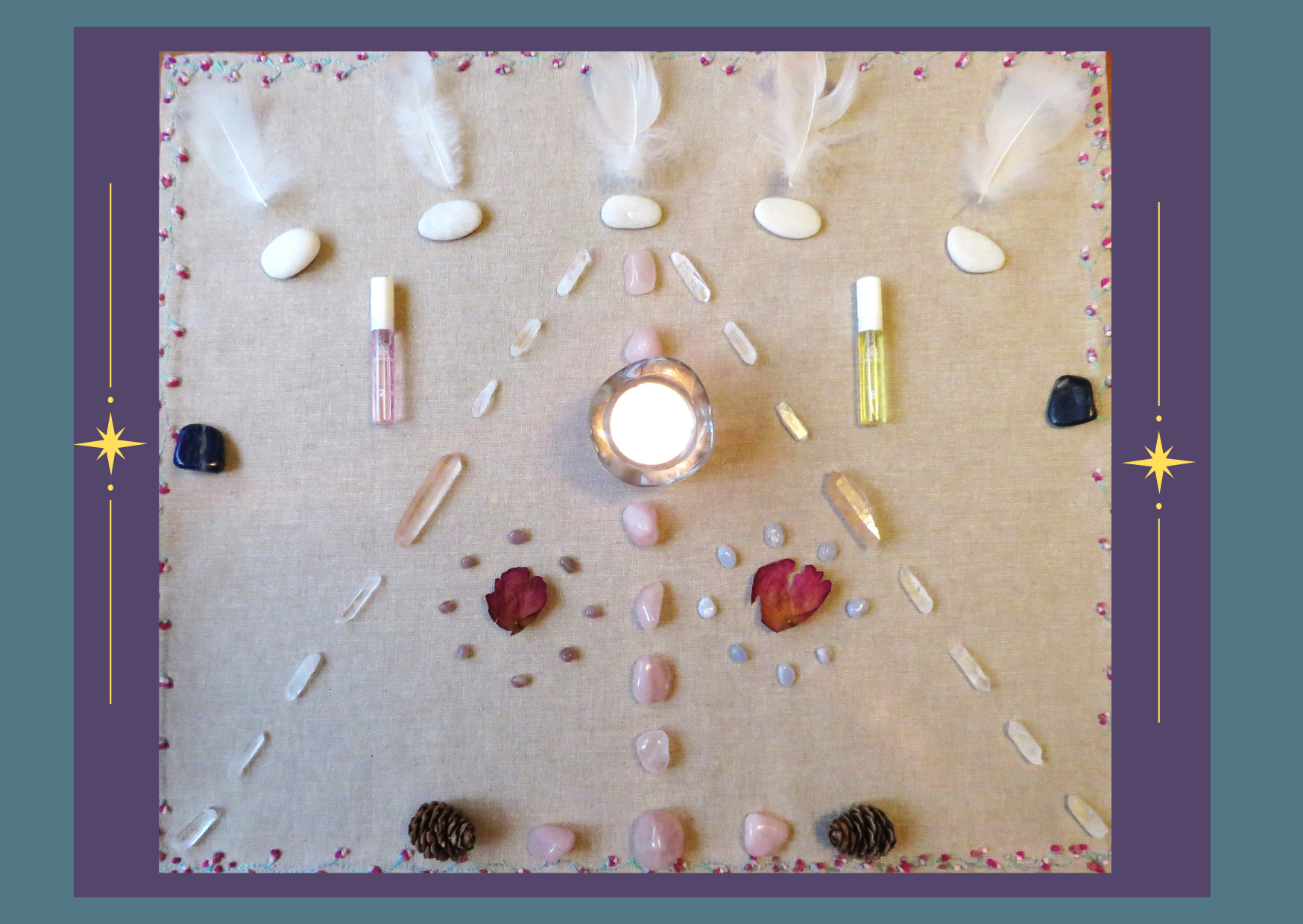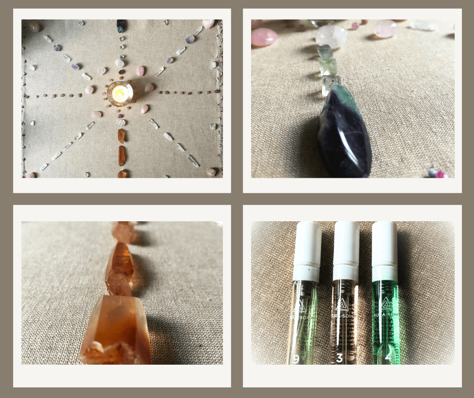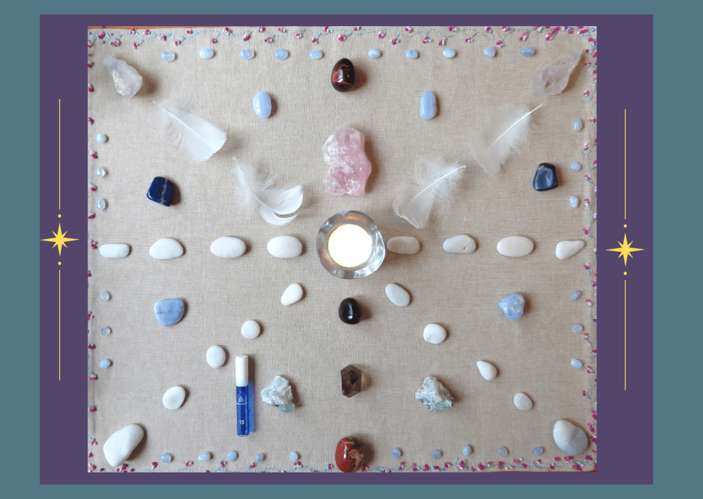 The grid needed to have more fire than usual, so four candles were placed, each one in its own corner. Once the flames were lit, I was instructed to place water in the center. Next, the quartz crystal circle was aranged around the water. This circle felt like a representation of the stone circles. Then an amethyst point was placed in North, South, East and West of the grid, connecting the circle to each of the four directions and holding all in balance.