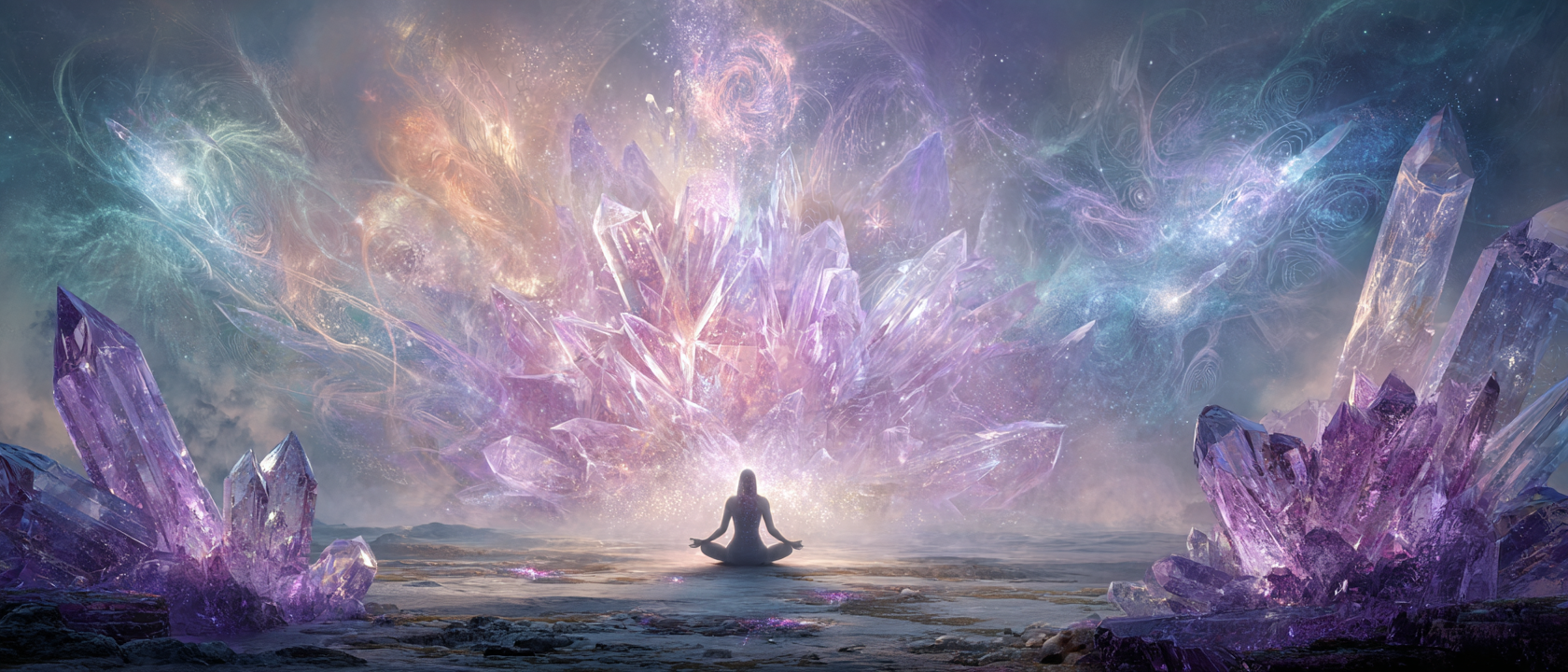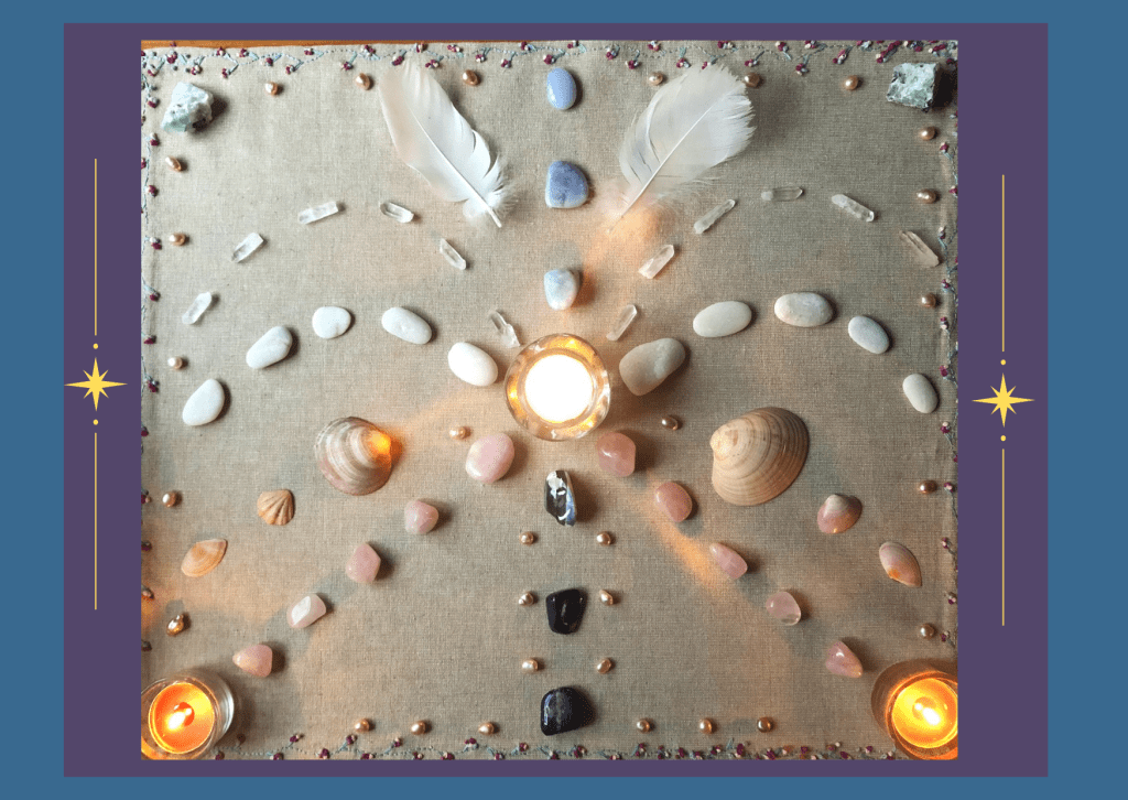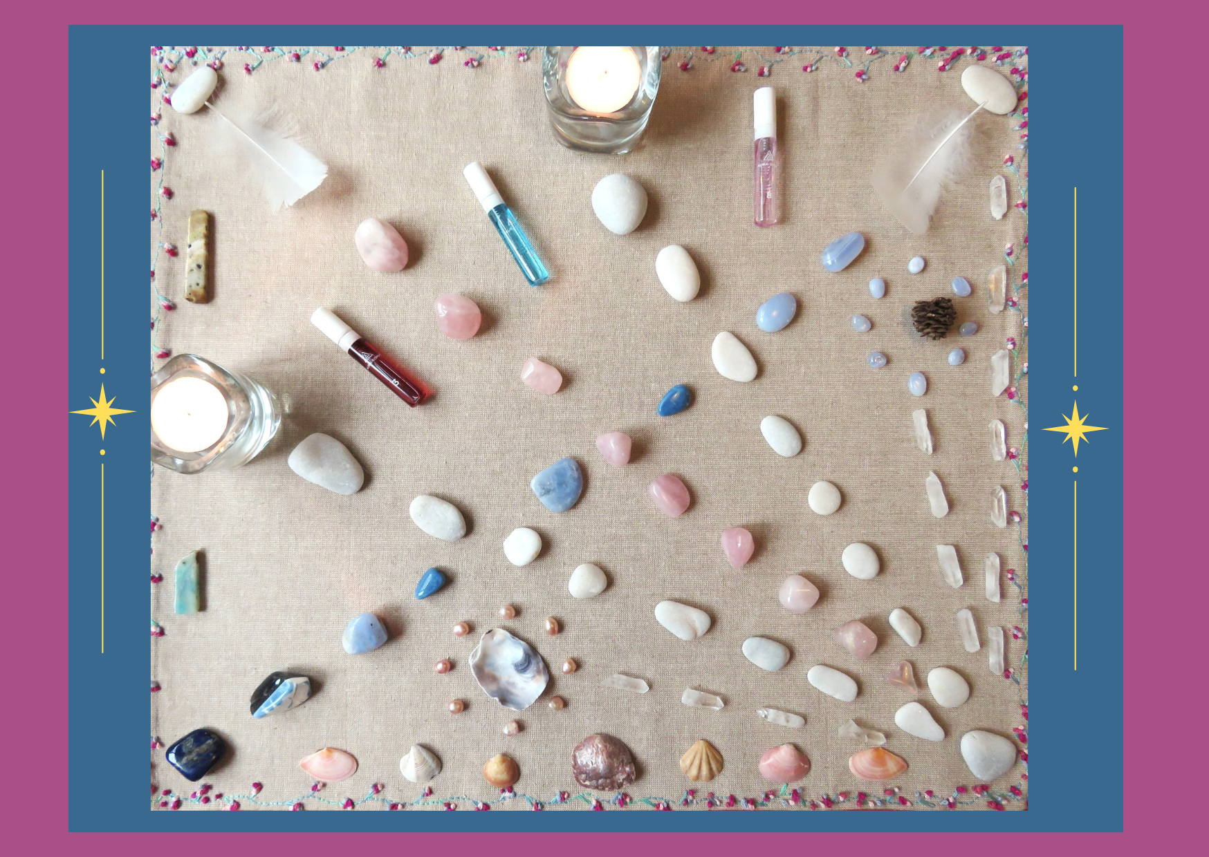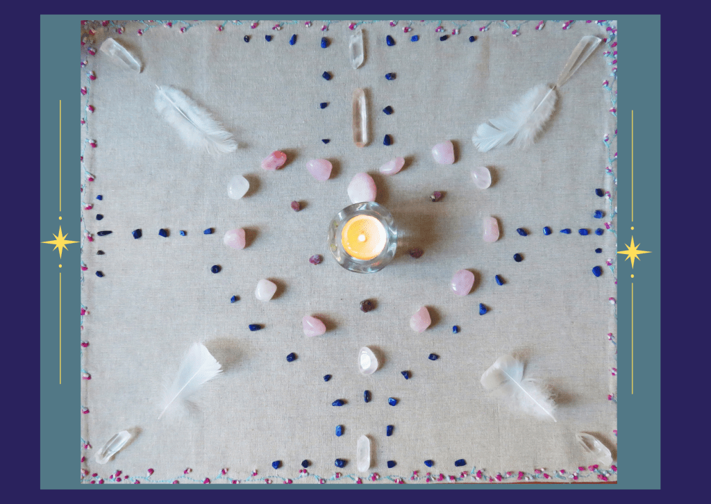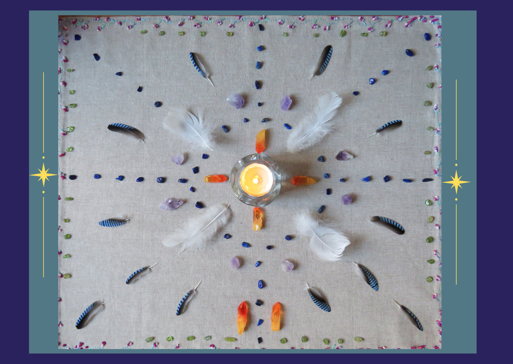 The grid needed to have more fire than usual, so four candles were placed, each one in its own corner. Once the flames were lit, I was instructed to place water in the center. Next, the quartz crystal circle was aranged around the water. This circle felt like a representation of the stone circles. Then an amethyst point was placed in North, South, East and West of the grid, connecting the circle to each of the four directions and holding all in balance.