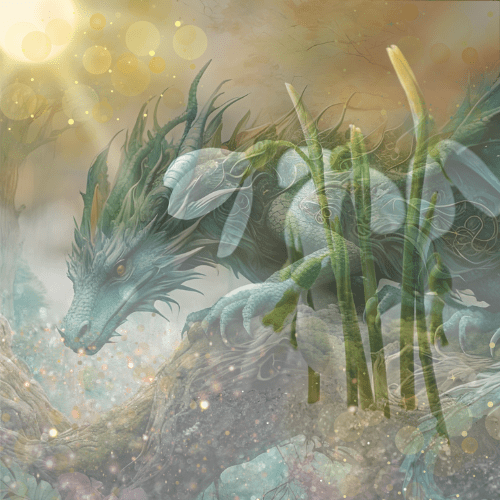 The blue water dragon is still. It’s present, but it’s quiet. Then my breath becomes more fiery and it starts to melt the snows and the crystals of the snow start to melt away and become the water of the blue dragon. It’s adding that layer of elemental energy to the green. They work together. The golden dragon of the sun appears above, warming the soil; warming the plants, so now other things begin to grow. Some things grow in the cold and other things need the warmth. The green dragon starts to become more alive now, and the white dragon has faded away, melted with the snow. The blue is becoming more vibrant and alive, and the rain comes, the sun shines, and it’s spring.