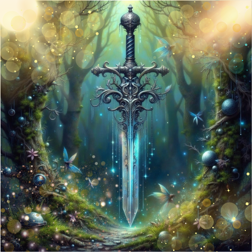 Now, I see a sword, standing with its point embedded in the soil in the woods. But there’s light around the sword, like Excalibur, yet it’s not Excalibur, it’s just a sword that has to do with the energies of winter. The Abundance King of winter. And he’s smiling. And I’m still breathing up that gold of the solar plexus and exhaling that magenta that it becomes as it moves through the heart. I’m sending that light to those images. And the energy is moving up to the sky.