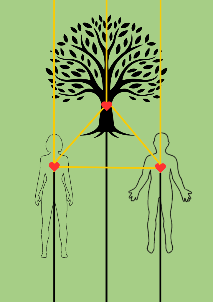 At this point, I was told to do an energy connection with the tree. Chris was told to make the initial connection by physically touching the tree trunk and connecting his heart to the heart of the tree. Next, he was to visualise the yellow line moving up to the sun and the black line moving down to the Obsidian dragon at the centre of the earth. We were then joined in a Triangle, just as Nadia and I had experienced when we first made the connection to this tree.