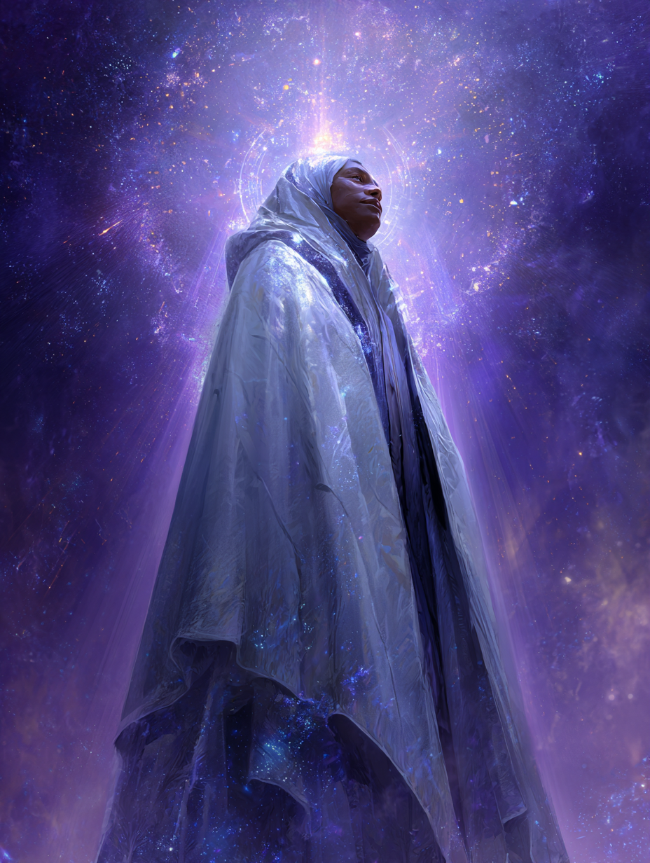 The upper part of this cloak encircles the head, and connects you to universal intelligence and/or the angelic realms. The lower part encapsulates your body so that you can translate the light languages and codes from these planetary beings into knowledge the world needs. It provides the channel frequency you need to allow these guides through and to help with your work as a planetary healer. It sets up a resonant field where Guides from other planetary dimensions can come in and work through you, especially in a healing capacity.