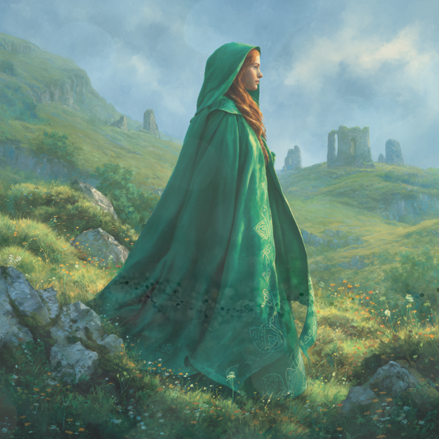 The Brigit Cloak is a green cloak that represents the fertility of the land. In wearing this cloak you are claiming land for the Goddess, for the Divine Feminine. It is ‘reclaiming’ it, so it becomes part of the Goddess’s realm once more. It is also your work space. Your land. In that it becomes the place you work with, energetically. This could be miles of land, but each place will bear your energetic stamp and the land itself will recognise what you do, and the layer of energy you anchor there.