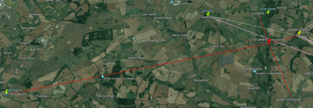 Again, I had to turn. This time to the west. This line seemed to go quite far and I wasn’t picking up a churchy feeling. Only later, when I went on google earth, did I make the line connection to Figsbury Ring, where we had anchored a white flame many years ago.
